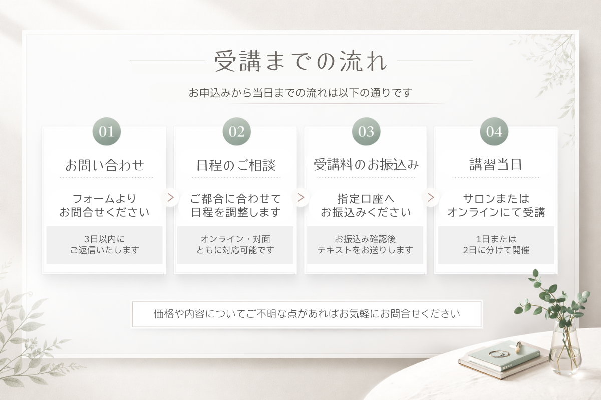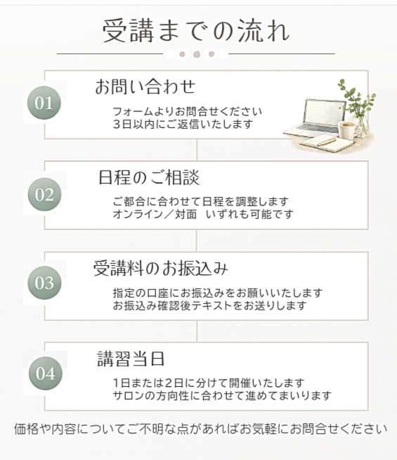 | 料金 | ベーシック講座 33,000円 アドバンス講座 55,000円 ベーシック講座+アドバンス講座 77,000円 同サロンスタッフ様の同時受講はお一人11,000円割引となります |